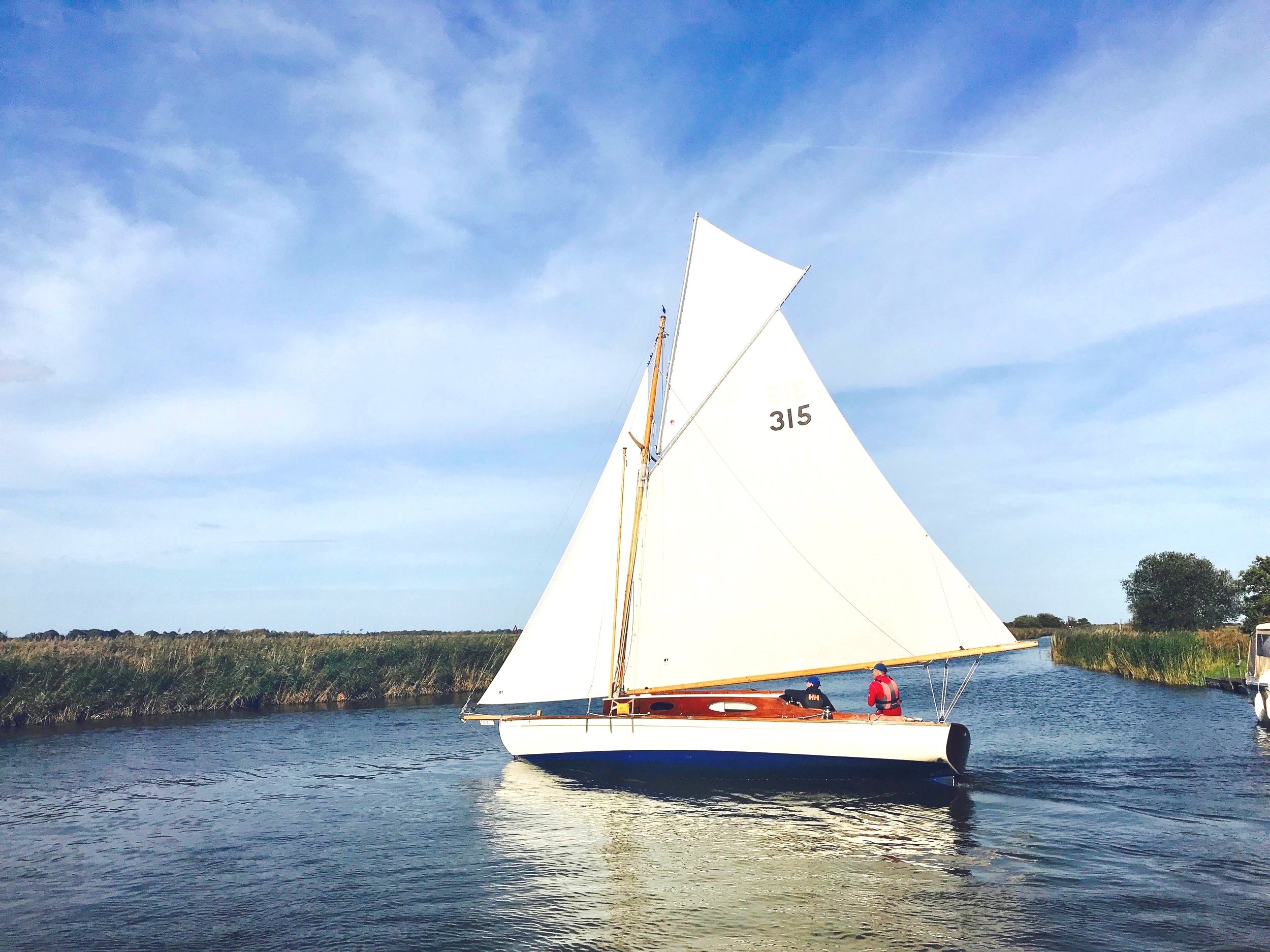 A high-aspect-ratio rig works extremely well on the Broads, as much of the sail area is high up and clear of obstructions. That’s why Bright Spark, with her gaff rig and integral topsail, is so effective on the river. With no boom vang the rig naturally twists in order to keep the sails driving in light airs. In medium to strong airs it also helps, as the change in apparent wind angle higher up is exaggerated due to the low down slowing effect of the surrounding banks and reeds. Keep looking up at the sail and burgee, the wind on the water is often quite different to that found at the masthead.