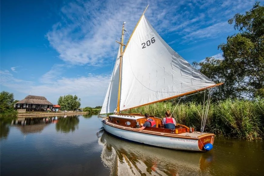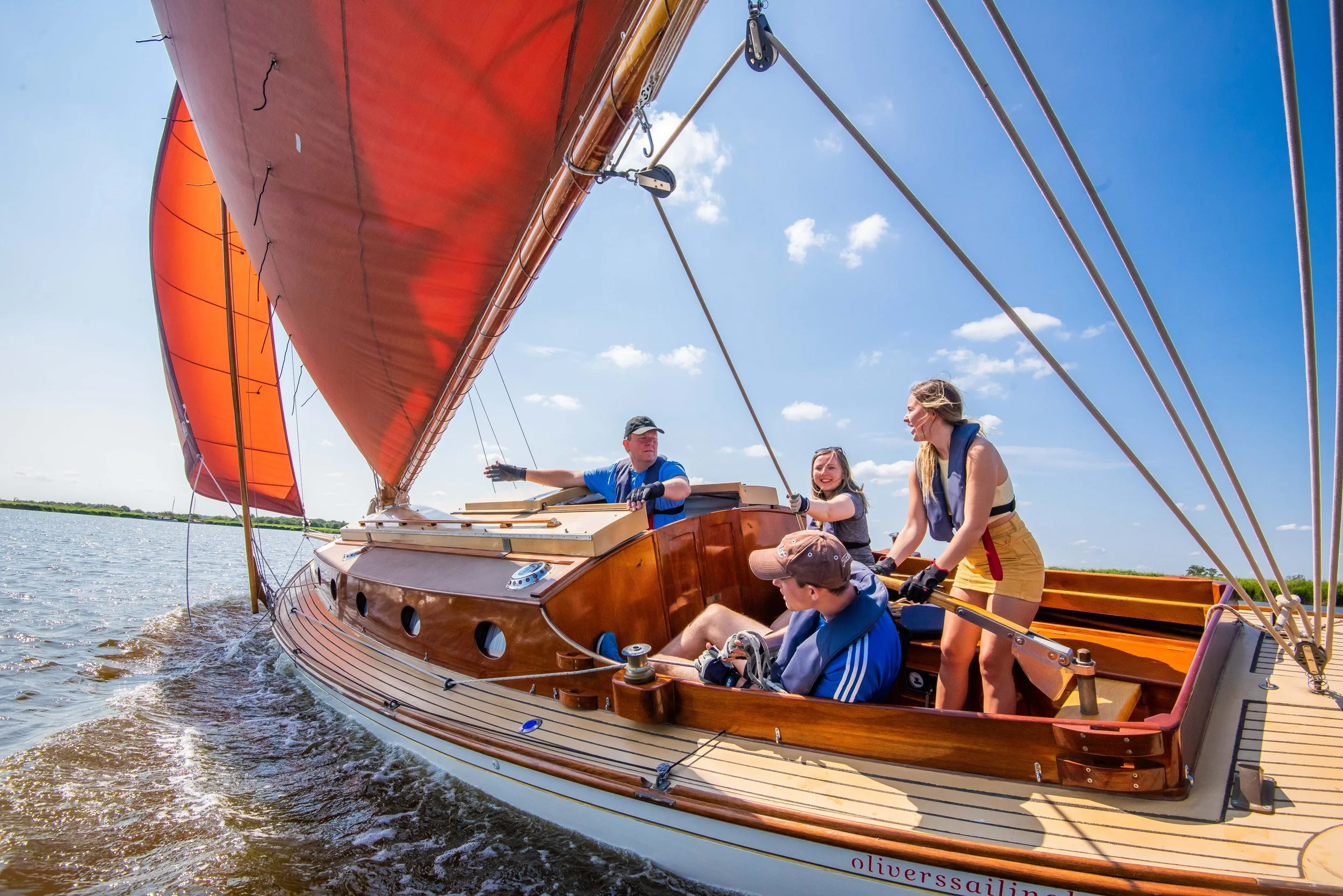As with most yachts, Norfolk Broad Sailing Cruisers have a tendency to slip sideways until their speed builds when going up wind, particularly as they are restricted in the length of keel due to the shallow waters, so it’s worth bearing off a little to build the speed coming out of a tack. Once you have gained some boat speed, and the keel begins to work effectively you can then point up. This means keeping the sails eased a little out of a tack to build the speed, sheeting in those last few inches once you’ve got the foils working. Similarly, if you want to squeeze past an obstruction, it helps to keep the boat speed up until the last minute. If you pinch from the start and loose way, you’ll drift sideways and find that you won’t have enough way to clear the obstruction.
